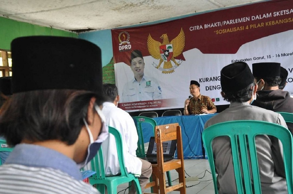 BANDUNG, InfoParlemen.com – Anggota DPRD Jawa Barat H. Dadan Hidayatulloh SAg MIpol menyosialisasikan Empat Pilar Kebangsaan kepada kalangan santri di Pondok Pesantren Annajat, Kampung Sumur Sari, Desa Sukasono Kecamatan Sukawening, Kabupaten Garut, Selasa (16/03/2021).