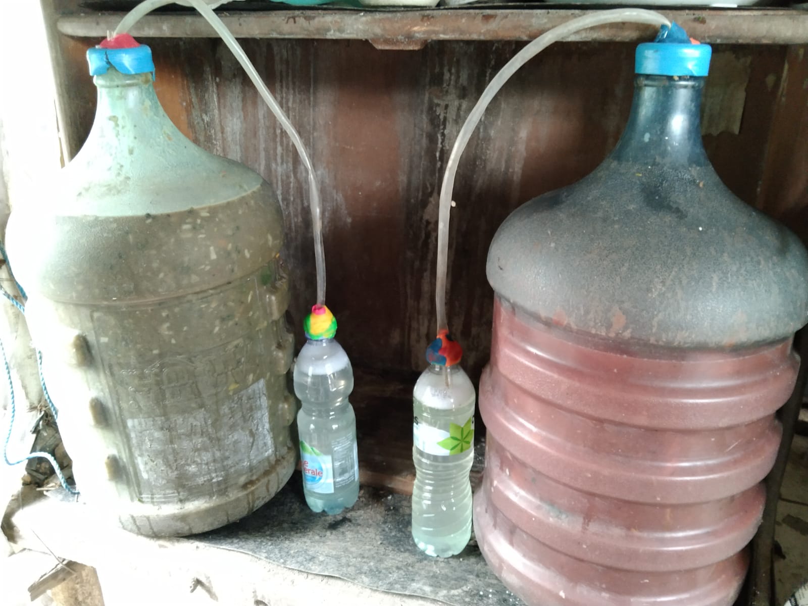 Selanjutnya, botol air mineral kecil diisi air sabun dan ditutup. Kemudian selang kecil dipasang pada tutup air mineral kecil dan selang tersebut juga disambungkan ke tutup galon air.