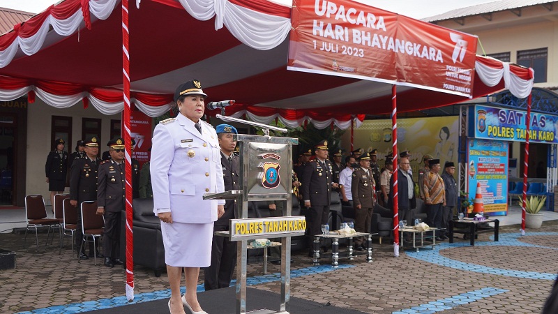 Bupati Karo selaku Inspektur Upacara membacakan amanat dari Kapolda Sumut Irjen Pol Panca Putra Simanjuntak. Kapolda menyampaikan penghargaan dan rasa bangga kepada semua personel Polri khususnya anggota Polda Sumut yang tidak pernah merasa lelah dalam menjaga keamanan.