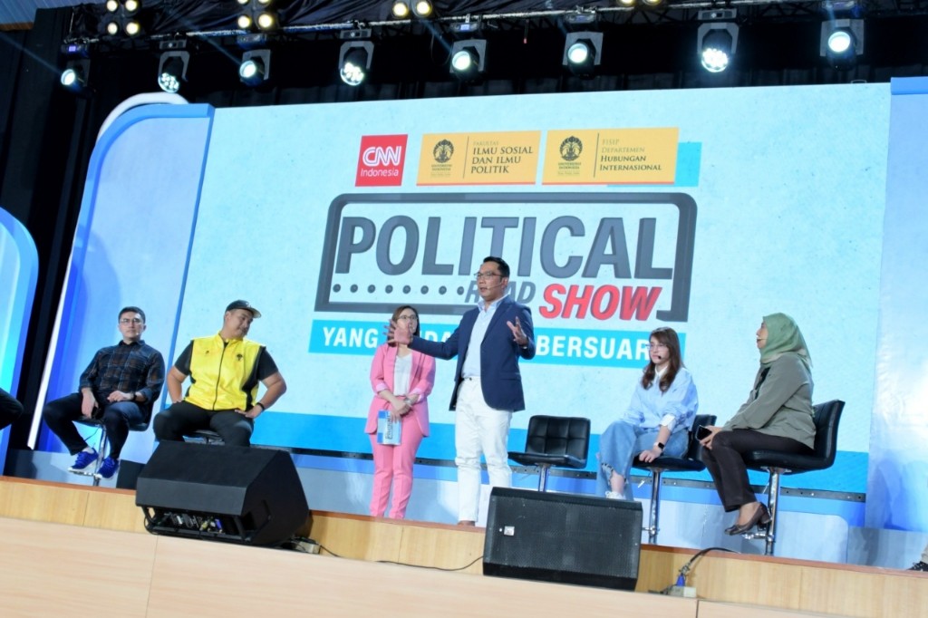 Gubernur Jawa Barat Ridwan Kamil menjadi pembicara pada program CNN Indonesia “The Nation Fest – Political Roadshow” di Balai Prawiro Purnomo Universitas Indonesia, Kota Depok, Rabu (30/8/2023).(Foto: Biro Adpim Jabar)