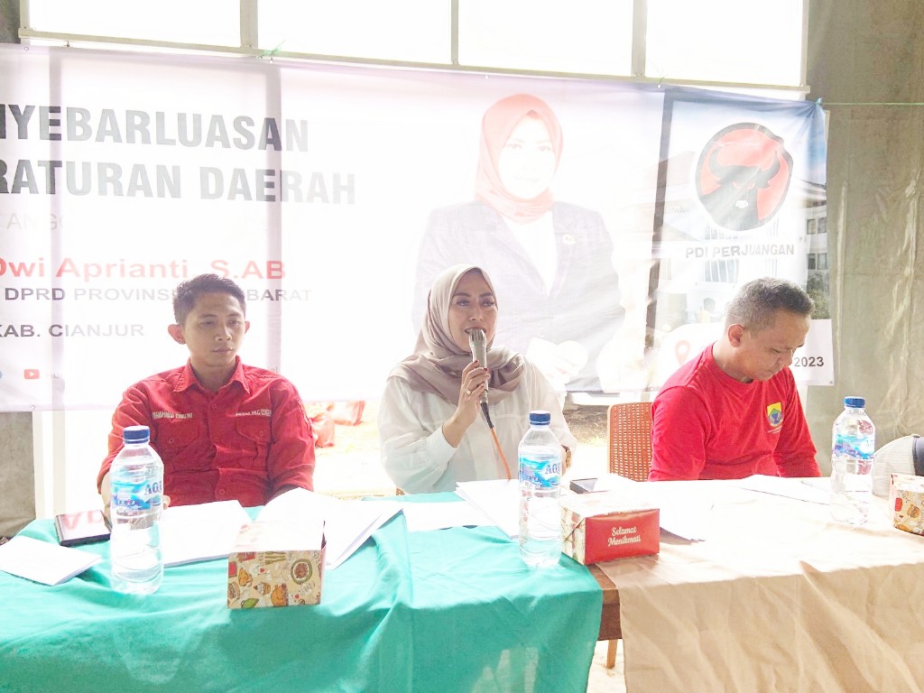 Anggota DPRD Jawa Barat Weni Dwi Aprianti melaksanakan kegiatan penyebarlusan Perda di Desa Cirumput, Kecamatan Cugenang, Kabupaten Cianjur, Jumat (3/11/2023) (Foto: Hms DPRD Jawa Barat)