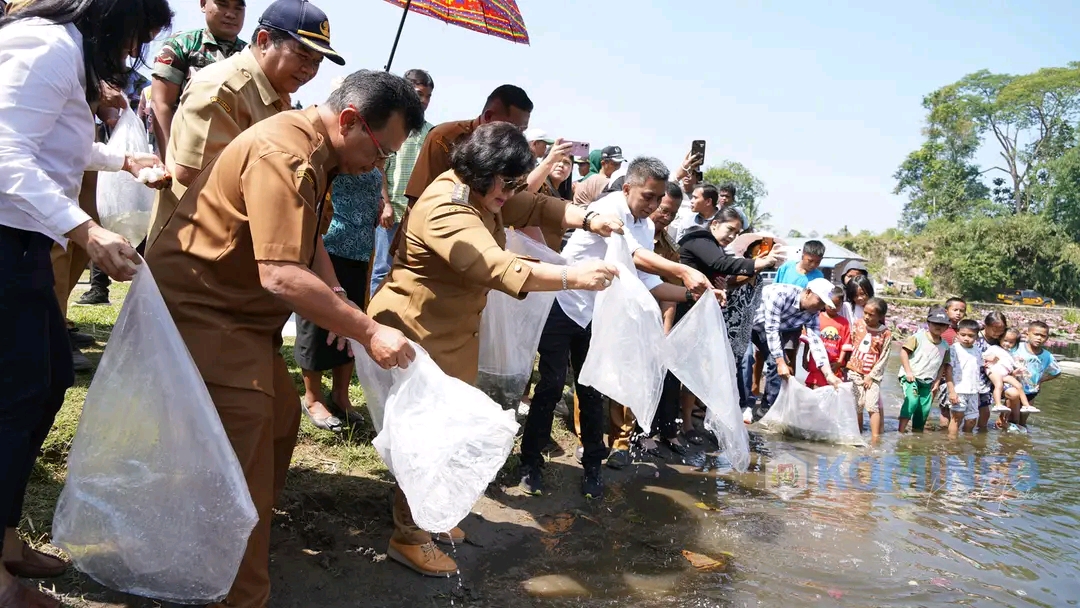 Bupati Karo Cory Sriwaty Sebayang bersama Wakil Bupati Karo Theopilus Ginting melakukan Penebaran Benih Ikan Nila di Tambak Mbelang Susuk, Desa Susuk Kecamatan Tiganderket Kab. Karo. (Foto: Diskominfo)