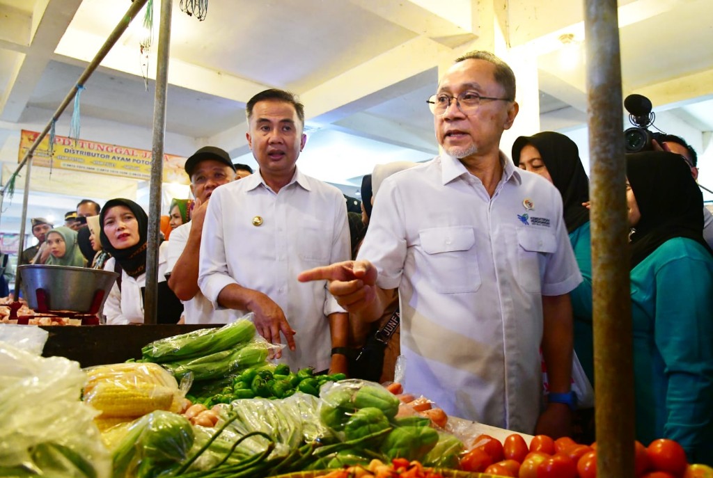 Penjabat Gubernur Jawa Barat Bey Machmudin bersama Menteri Perdagangan RI Zulkifli Hasan meninjau harga kebutuhan pokok di Pasar Tagog Padalarang.