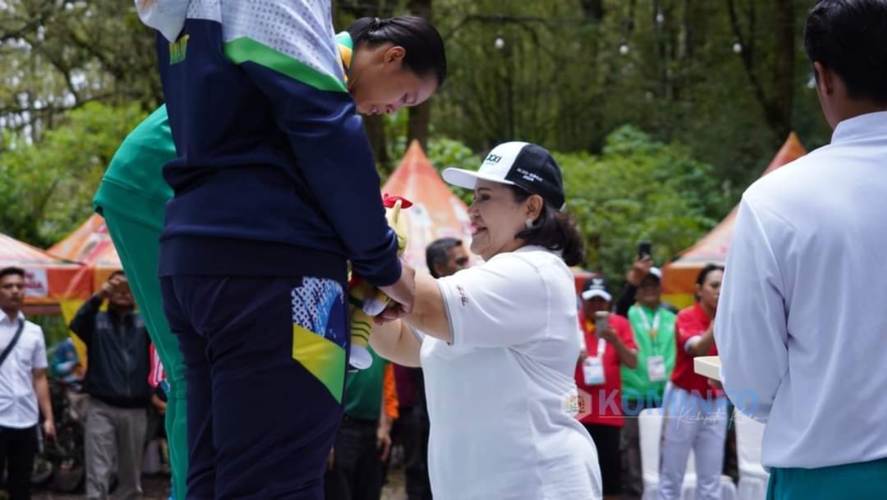 Bupati Karo Cory Sriwaty Sebayang memberikan medali kepada para atlet yang berhasil meraih kemenangan Pertandingan Sepeda Gunung PON XXI Aceh-Sumut. (Foto: Diskominfo)