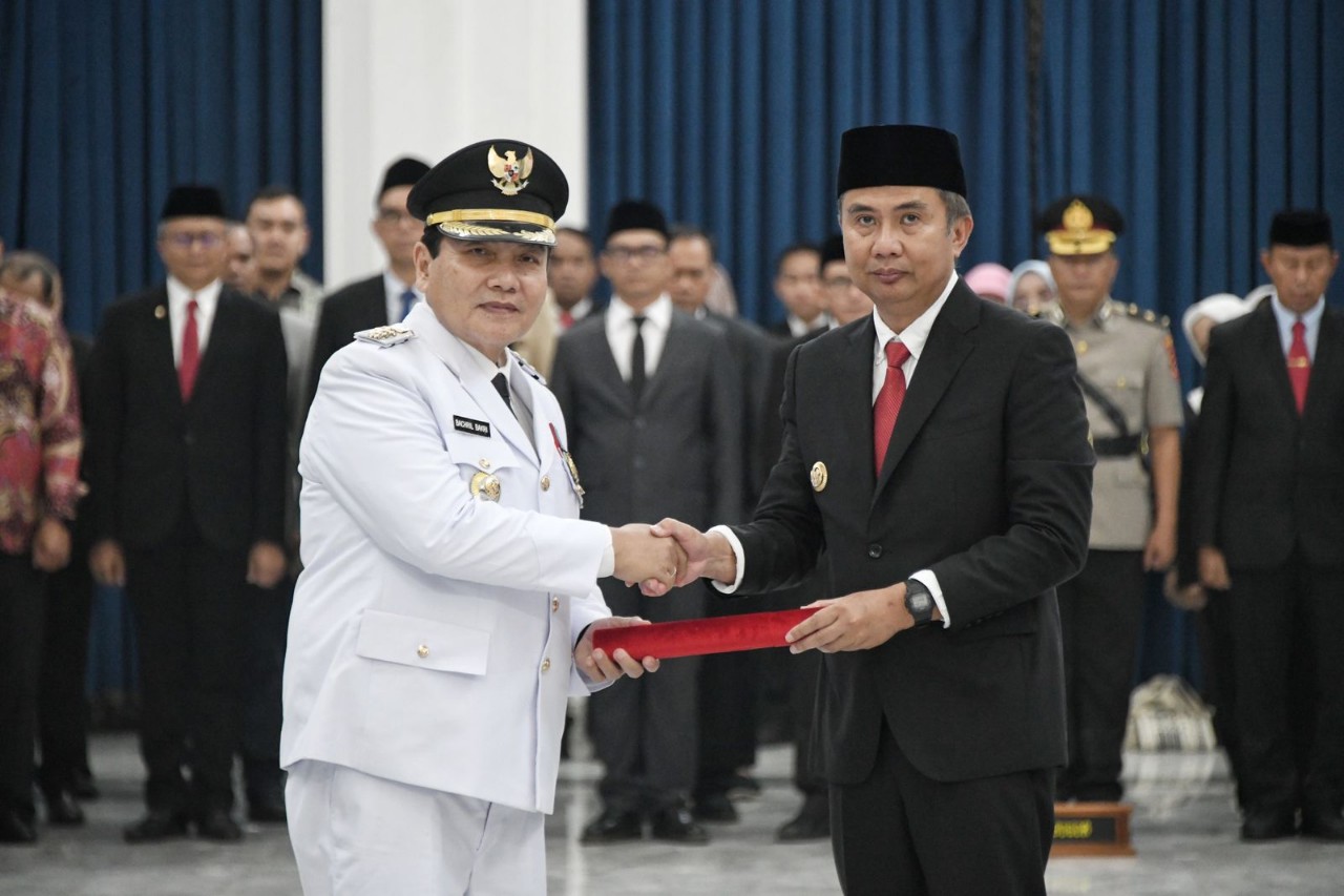 Pj Gubernur Jawa Barat Bey Machmudin melantik dan mengambil sumpah jabatan Bachril Bahri sebagai Penjabat Bupati Bogor di Aula Barat Gedung Sate, Kota Bandung, Kamis (26/9/2024).(Foto: Rizal FS/Biro Adpim Jabar)