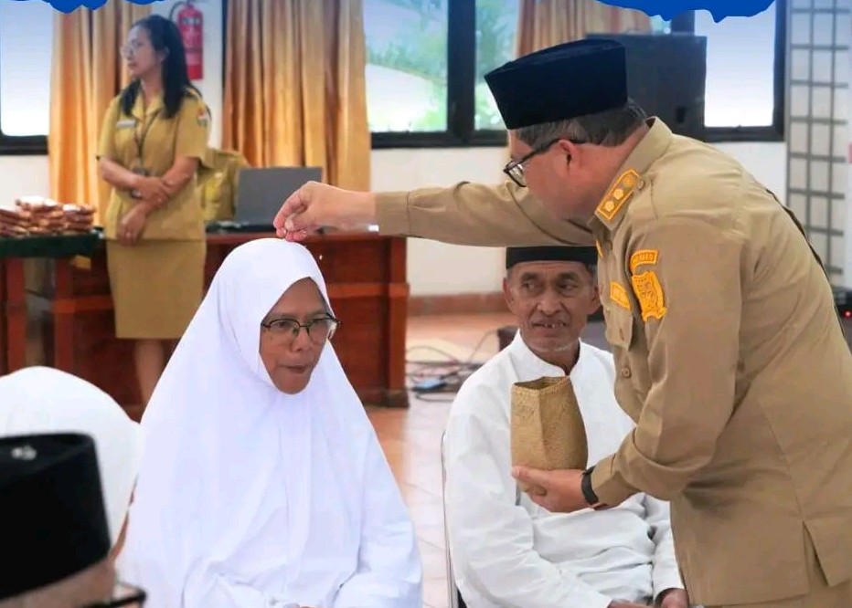 Wakil Bupati Karo, Komando Tarigan, SP., melaksanakan kegiatan Njunjungken Beras Piher kepada Jemaah Haji Kabupaten Karo Tahun 1447 H/2026 M di Aula Rakoetta Brahmana, Kabanjahe, Selasa (20/04/2026). (Foto: Diskominfo)