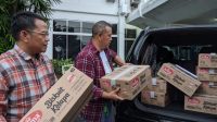 Petugas dari Dinas Sosial Jabar memasukkan logistik bantuan ke atas mobil untuk keperluan orang dengan Info selengkapnya